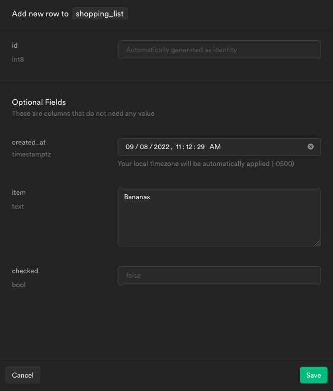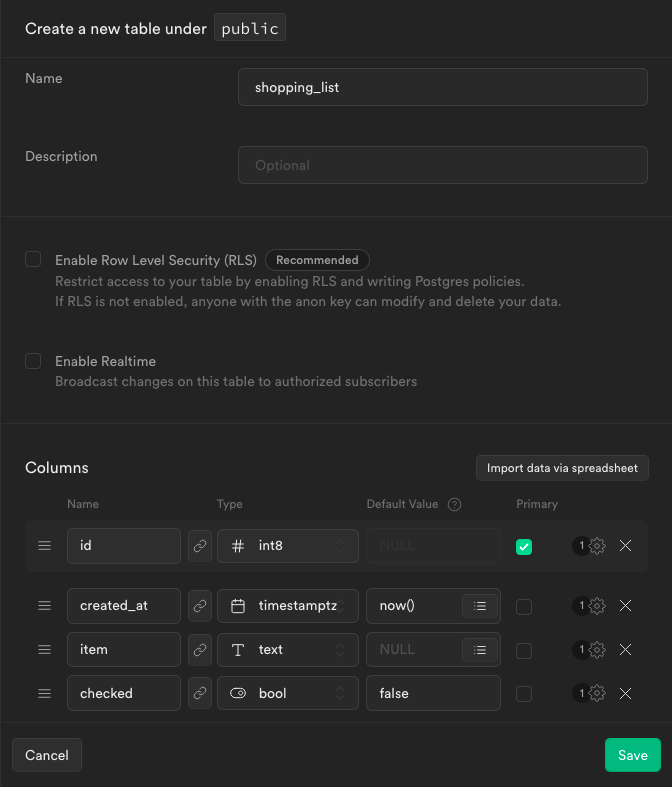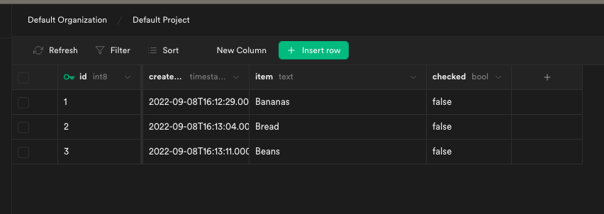 This tutorial’s example application is a shopping list. Thus, here and following the table name used is shopping_list, and the table has an item column with text content and a checked column with bool content. The checked column also has a default value of false. This is in addition to the default columns, id and created_at.